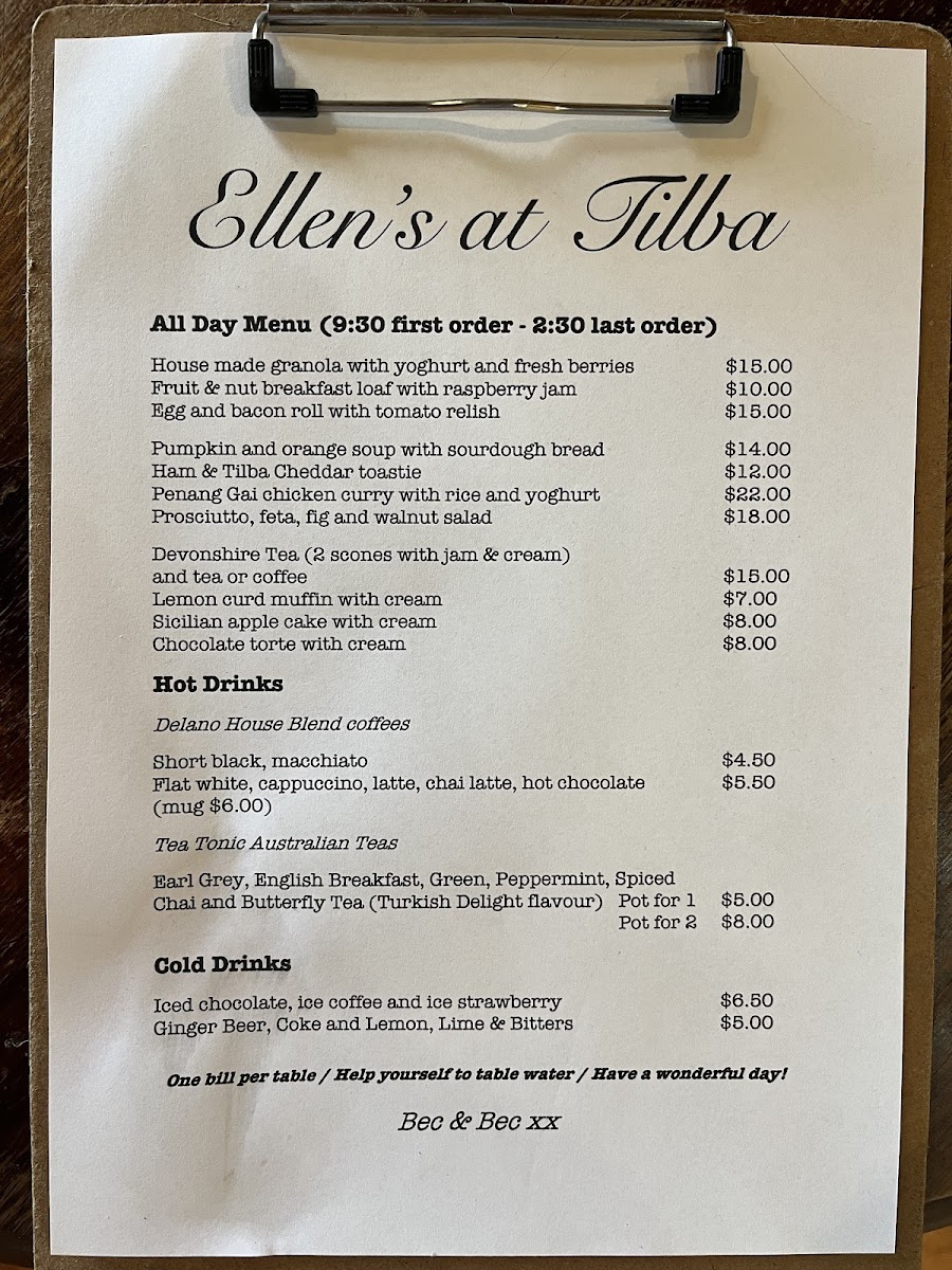 Ellens at Tilba (formerly Tilba Tea Pot) Menu